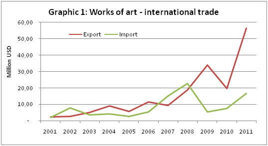 As exportações de obras de arte foram crescentes tanto em quantidade quanto em valores. Todavia o crescimento em valores foi muito superior ao crescimento das quantidades. Enquanto o primeiro subiu 2.300%, o segundo teve crescimento de 44%. Quanto às importações a variações nos valores, para o período, foi positiva em 660% enquanto as quantidades variaram positivamente em 30%. Disto resulta que os valores médios tiveram crescimento de 1.600% para as exportações de arte e 485% para as importações.