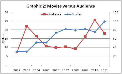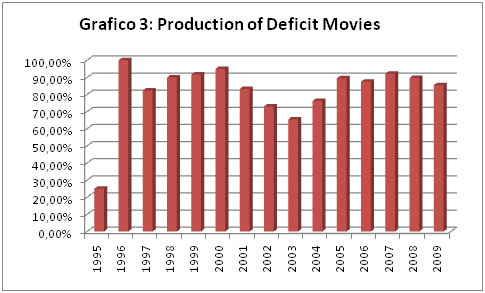 No mercado brasileiro de produções cinematográficas observou-se uma rápida expansão na quantidade de filmes produzidos a partir da lei do audiovisual e o volume de dinheiro correspondente. O que mais chama a atenção é que o público (demanda) para as produções nacionais não acompanhou o crescimento da oferta. Além disso, grande parte da demanda está concentrada em algumas produções de grande sucesso. O percentual de produções cuja bilheteria não cobre nem mesmo os recursos obtidos através das leis de incentivo ultrapassa 80%.