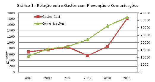 O gráfico abaixo mostra o caso brasileiro. Nele pode-se observar que a quantidade de comunicações aumentou continuamente apesar dos gastos terem se mantido praticamente estáveis nas primeiras observações, inclusive apresentando redução em 2009. O ano de 2011 mostra acentuada elevação dos gastos do COAF, levando-se em conta alguma defasagem de tempo entre os gastos e seu impacto nas comunicações é de se esperar que estas aumentem nas próximas observações que forem sendo disponibilizadas. Caso contrário dever-se-á considerar as outras situações possíveis.