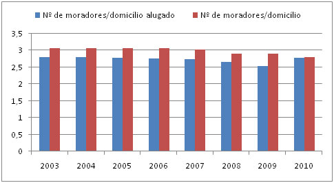 Uma importante variável sinalizadora é o número de moradores por domicílios e por domicílios alugados. Espera-se que com a suposta elevação na demanda por moradias sem o respectivo aumento da população houvesse a diminuição do número de moradores por domicílio. Todavia constatou-se redução insignificante no período de 2003 a 2010. O número de moradores por domicílio alugado que era de 2,8 reduziu para 2,78, enquanto nos domicílios próprios reduziu de 3,07 para 2,81. Estes números afastam a hipótese de estar havendo aumento significativo de pessoas que deixam de habitar em grupos maiores para morar sozinhos ou em grupos menores. Desta forma, a análise utilizando o conceito de famílias parece uma aproximação bastante adequada.