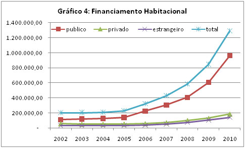 A evolução da oferta de crédito imobiliário no Brasil apresentada na tabela acima mostra uma tendência de alta nos últimos anos. Todavia, o volume parece ainda ser baixo para sustentar e justificar todo o volume de vendas, principalmente dos imóveis mais caros. A maior parte do crescimento do financiamento habitacional é explicada pela oferta de crédito de bancos públicos para a parcela da população com renda mais baixa e para a qual as condições do financiamento são mais favoráveis. A forte alta dos financiamentos habitacionais a partir de 2007 concentra-se nos bancos públicos, notadamente na Caixa Econômica Federal gestora de programas governamentais para a população de baixa renda.