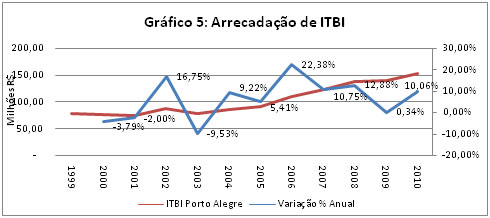 O gráfico 5 mostra a evolução da arrecadação do imposto sobre transmissão de bens imóveis (ITBI) que apresentou comportamento na mesma direção da venda de imóveis.